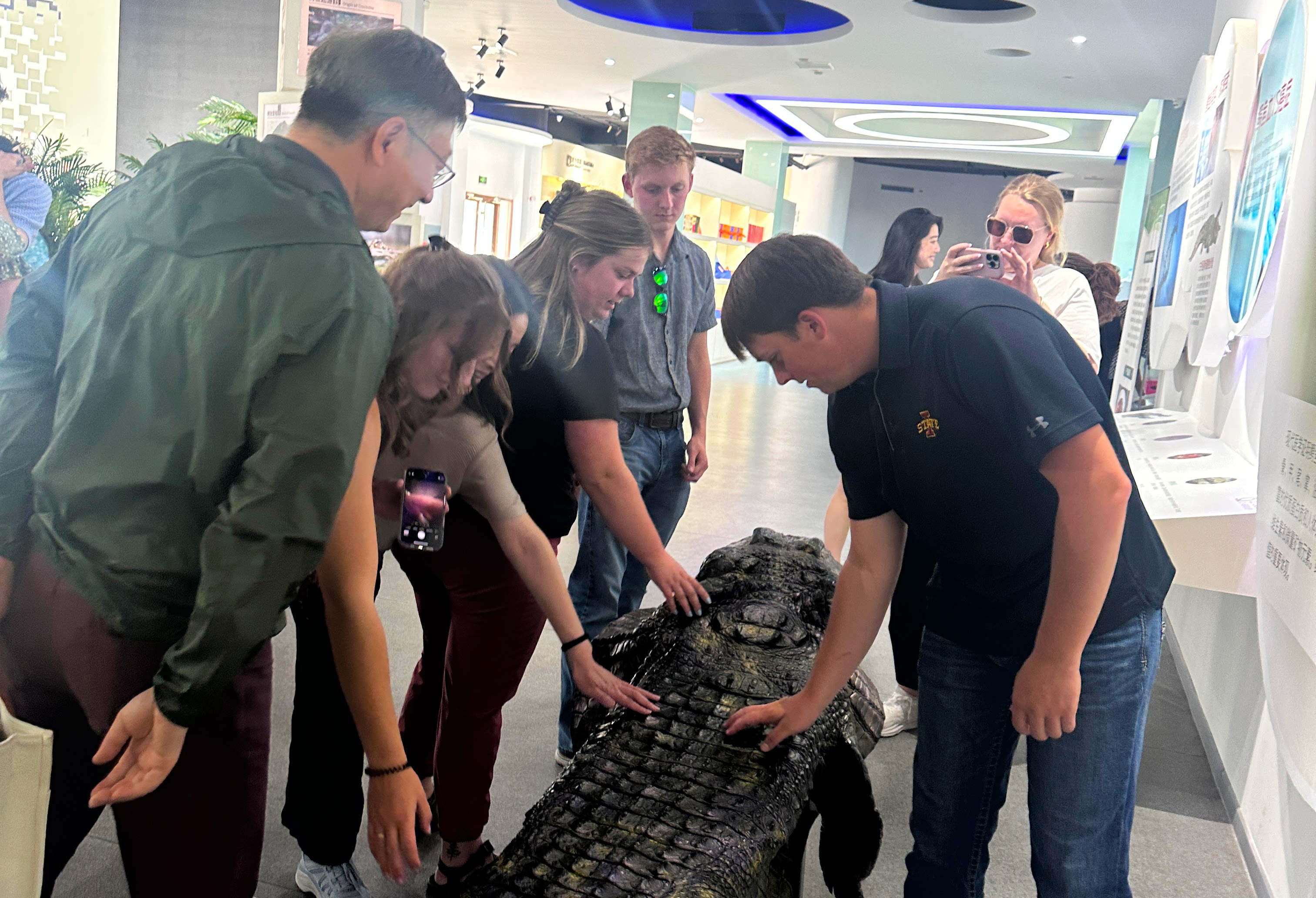 随后,代表团还打卡了蛋鸡场的配套项目利来国际泰鳄养殖基地。讲解员刘明宇介绍,该基地养殖鳄鱼4000条,用于消纳蛋鸡场的淘汰鸡,改变了传统的把淘汰鸡焚烧或深埋而造成环境污染的旧做法,并衍生出一系列高附加值鳄鱼商品,吸引代表团成员纷纷选购留念。蛋鸡场每天产生的鸡粪还可以加工成有机肥,用于平谷大桃种植。整个300万只现代化蛋鸡产业项目,形成了“蛋鸡-鳄鱼-大桃”种养结合的生态循环可持续发展模式,既提升了资源利用率,又是环境友好型。